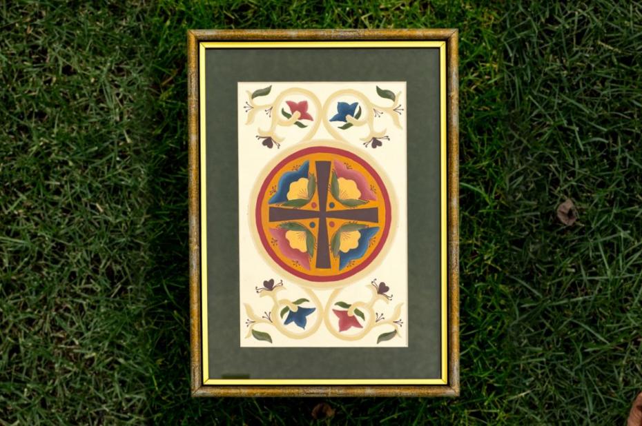 Prima lucrare prezintă în centrul compoziției o cruce circulară încadrată de motive florale stilizate. Formele sunt curate, simetrice, iar paleta cromatică este caldă și echilibrată. Centrul picturii este construit ca un medalion bizantin, unde crucea este însoțită de patru flori, simbol al celor patru puncte cardinale și al răspândirii luminii lui Hristos în lume. Fondul deschis, în contrast cu rama aurie și verde închis, pune în valoare delicatețea picturii, făcând din această piesă un obiect decorativ elegant.