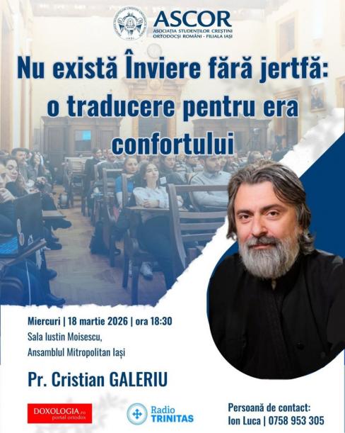 Asociația Studenților Creștini Ortodocși Români – filiala Iași organizează conferința intitulată: „Nu există Înviere fără jertfă: o traducere pentru era confortului”, susținută de părintele Cristian Galeriu. Evenimentul va avea loc, începând cu ora 18.30, în Sala Iustin Moisescu din cadrul Ansamblului Mitropolitan Iași.