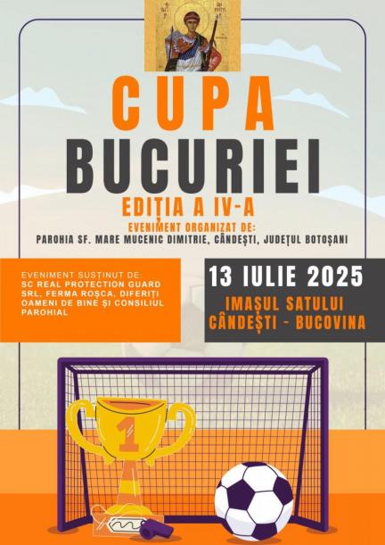 În această zi va avea loc, pe imașul satului Cândești – Bucovina, evenimentul „Cupa Bucuriei – Ediția a IV-a”, o activitate sportivă dedicată copiilor din parohiile vecine, organizat de Parohia „Sfântul Mare Mucenic Dimitrie” din Cândești, județul Botoșani, cu sprijinul unor sponsori locali și al consiliului parohial.