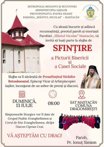 Preasfinţitul Părinte Nichifor Botoşăneanul, Episcop-vicar al Arhiepiscopiei Iaşilor, va oficia slujba Sfintei Liturghii la Parohia „Sfântul Nicolae” – Mastacăn, din Protopopiatul Piatra Neamț, prilej cu care va sfinți pictura bisericii și casa socială.