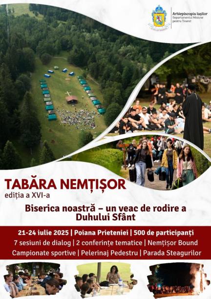 Departamentul Misiune pentru Tineret din cadrul Sectorului Misiune al Arhiepiscopiei Iașilor organizează, în perioada 21-24 iulie 2025, cea de-a XVI-a ediție a Taberei Nemțișor, cu tema: „Biserica noastră – un veac de rodire a Duhului Sfânt”. Evenimentul va avea loc în Poiana Nemțișor, în apropierea Mănăstirii Neamț, și va reuni peste 500 de tineri din Arhiepiscopia Iașilor și din alte zone ale țării în jurul valorilor credinței, comuniunii și misiunii creștine. Prin conferințe, sesiuni de dialog și ateliere tematice, participanții vor reflecta asupra roadelor lucrării Bisericii Ortodoxe pe teritoriul nostru în ultimul secol, începând cu momentul ridicării Bisericii Ortodoxe Române la rang de Patriarhie.