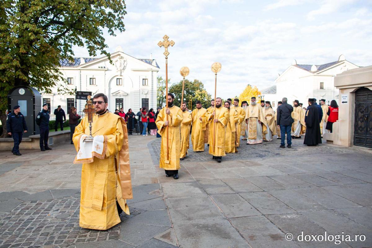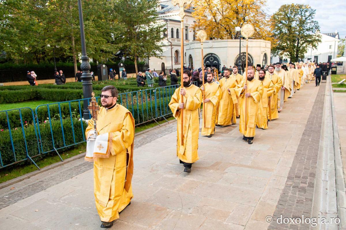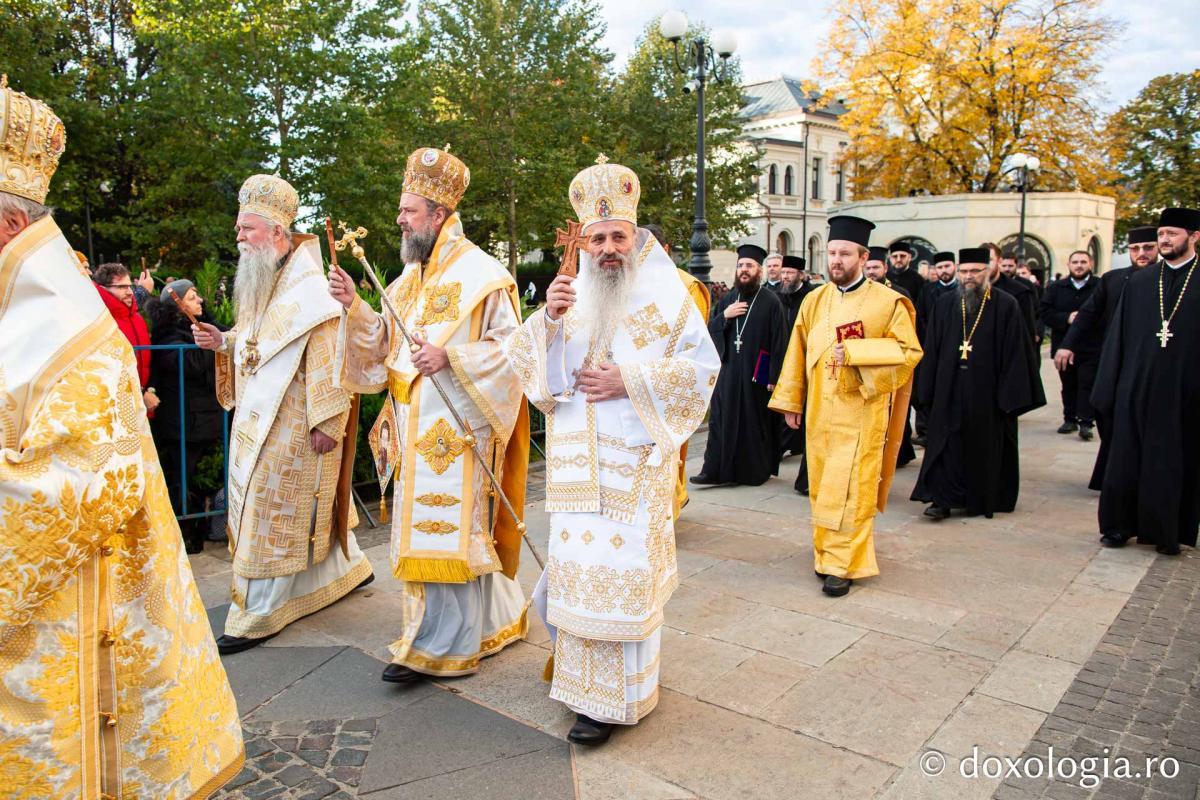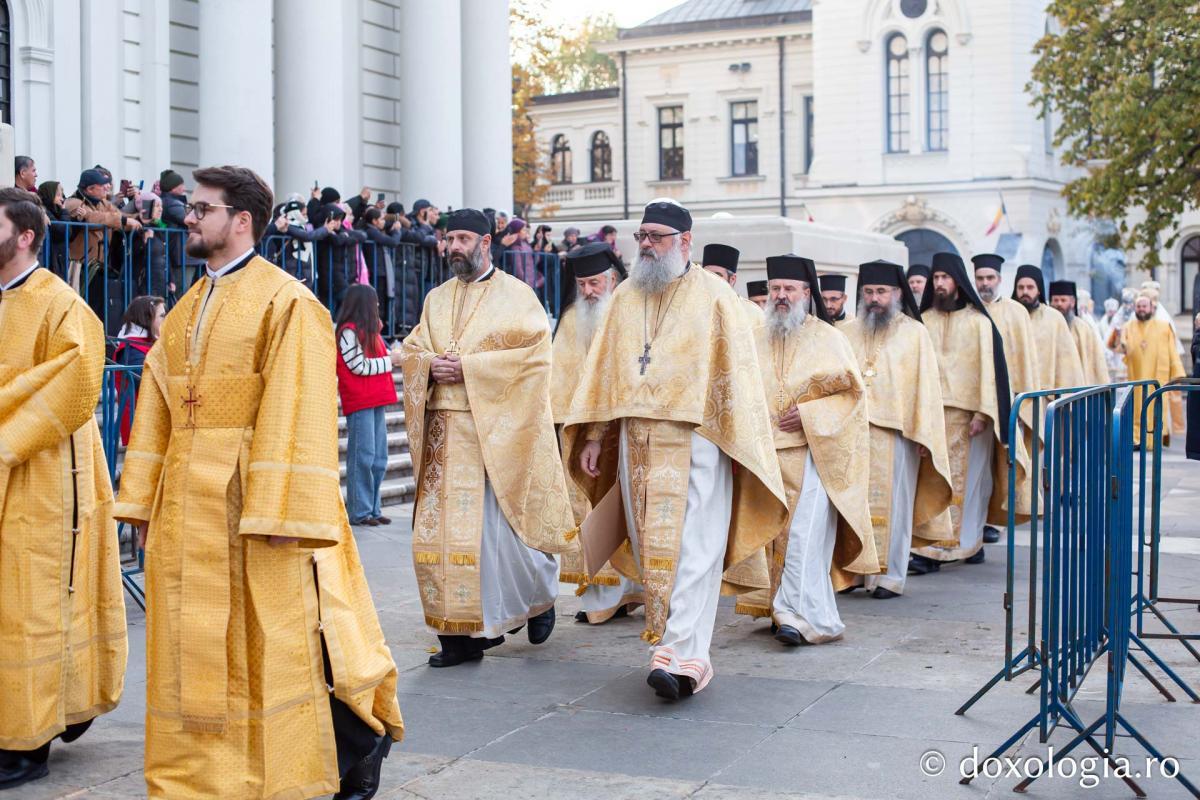 La Sfânta Liturghie prilejuită de hramul Sfintei Cuvioase Parascheva de la Iași slujește un sobor de ierarhi, preoți și diaconi, în frunte cu Înaltpreasfințitul Părinte Teofan, Arhiepiscopul Iașilor și Mitropolitul Moldovei și Bucovinei.