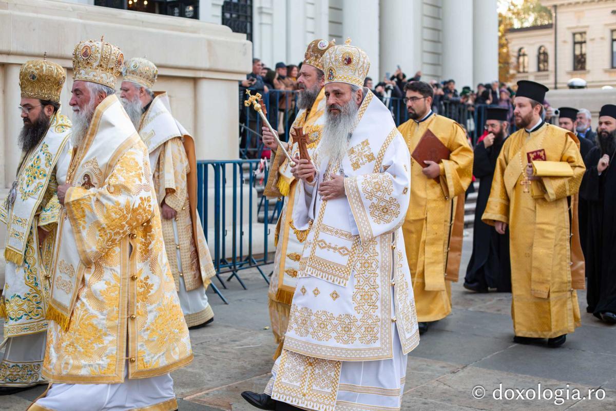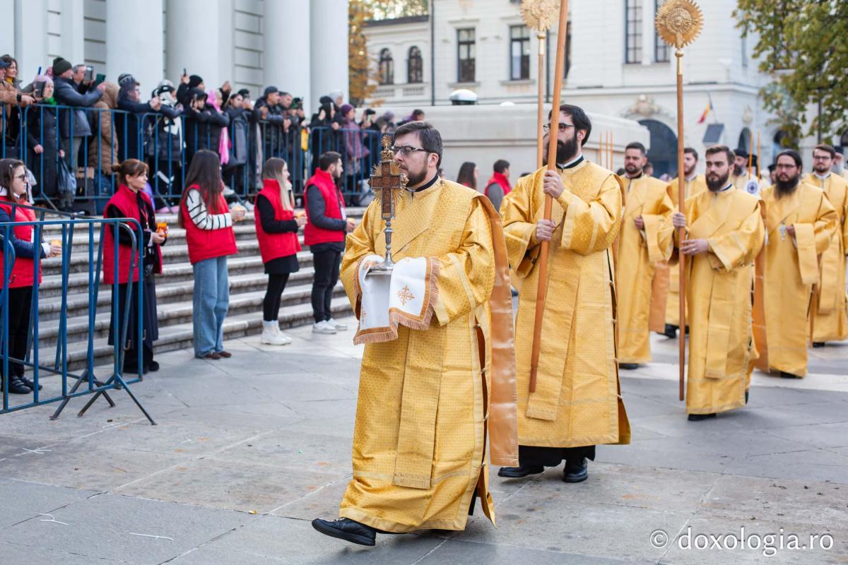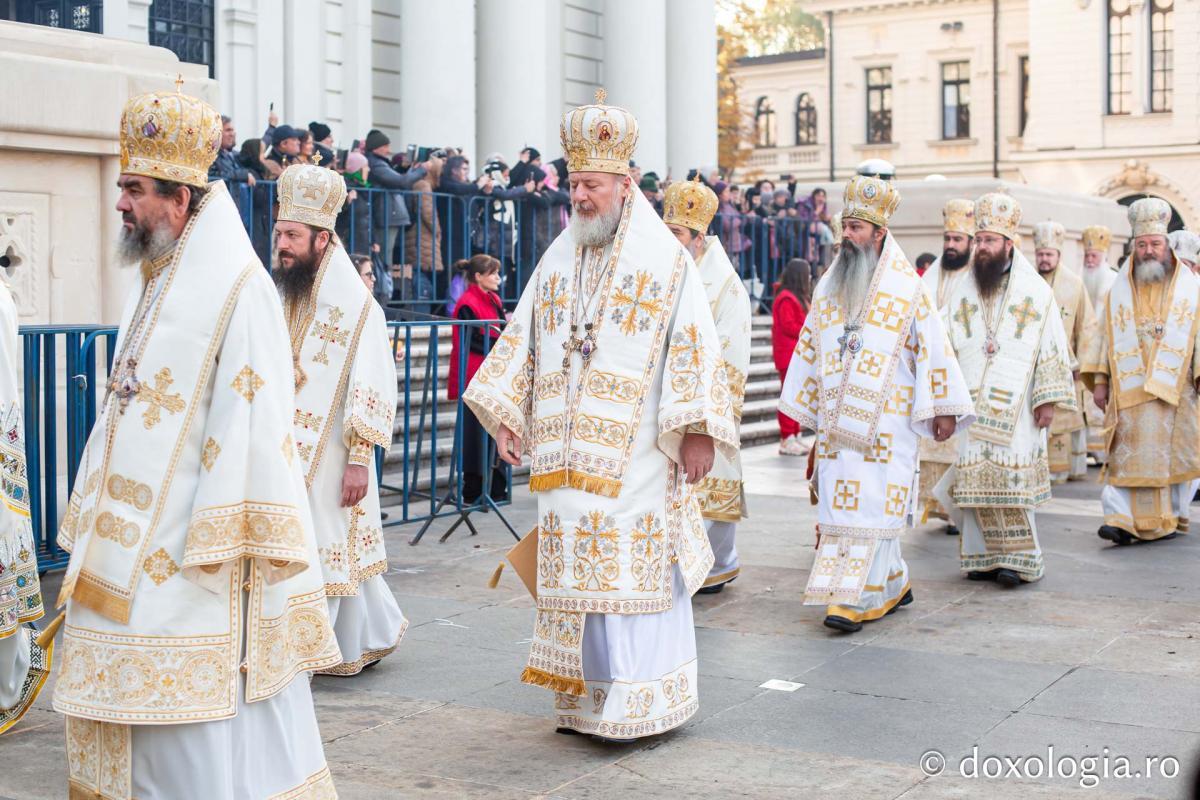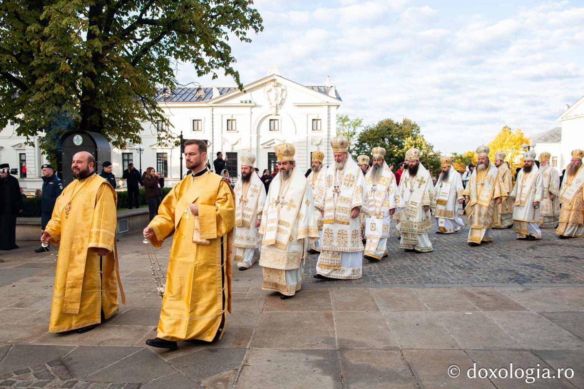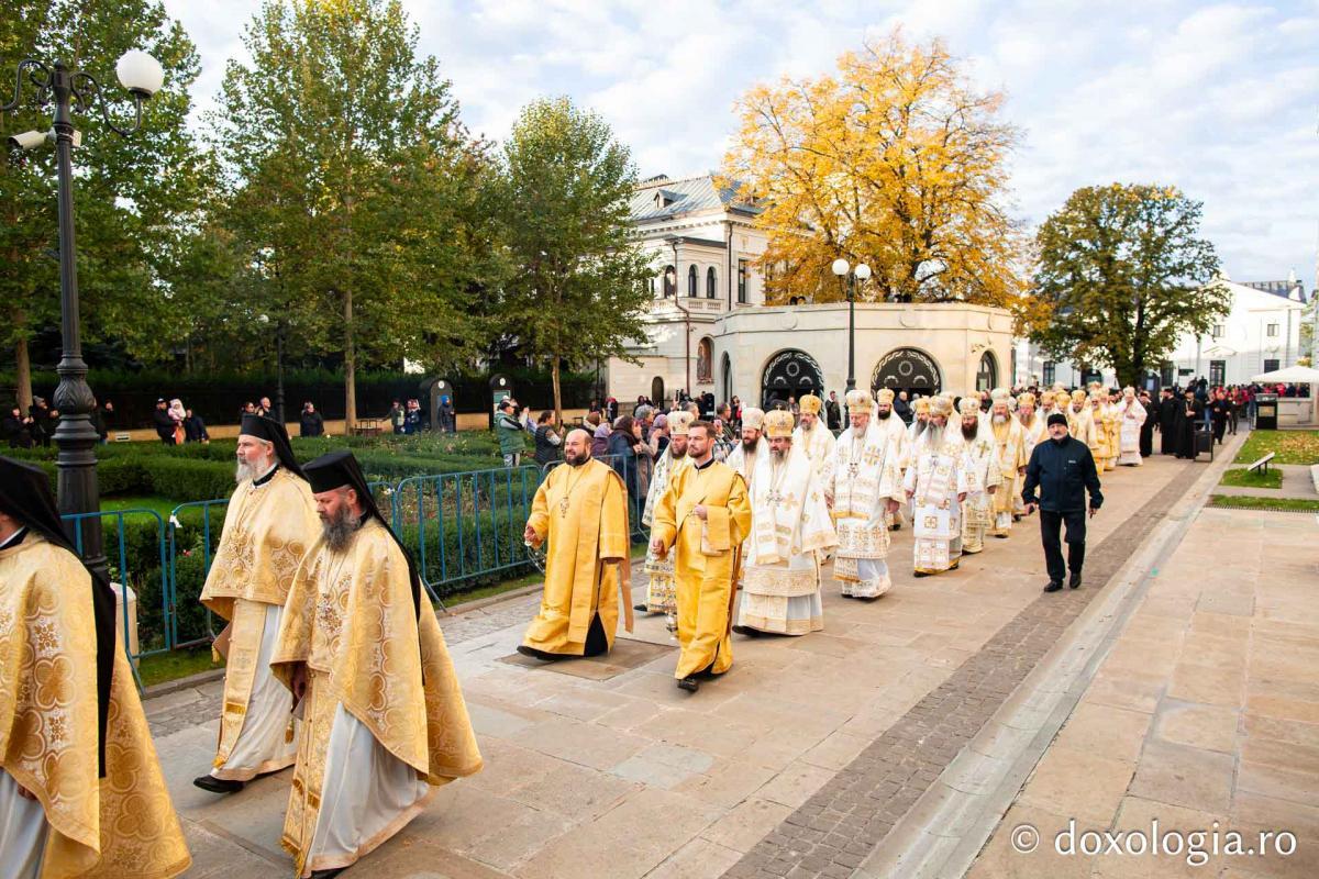 La Sfânta Liturghie prilejuită de hramul Sfintei Cuvioase Parascheva de la Iași slujește un sobor de ierarhi, preoți și diaconi, în frunte cu Înaltpreasfințitul Părinte Teofan, Arhiepiscopul Iașilor și Mitropolitul Moldovei și Bucovinei.