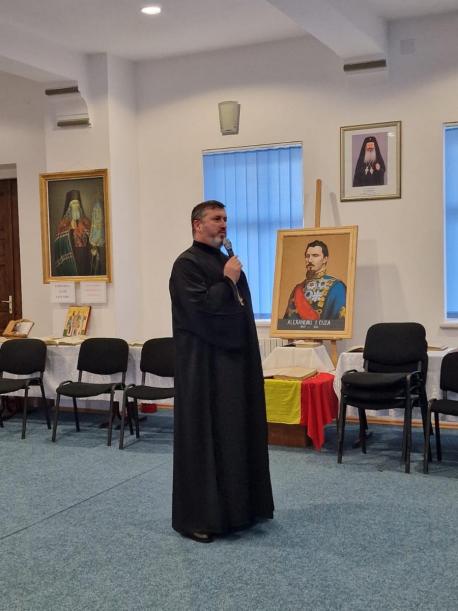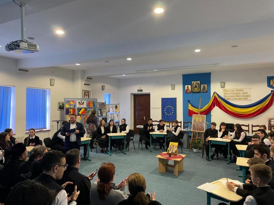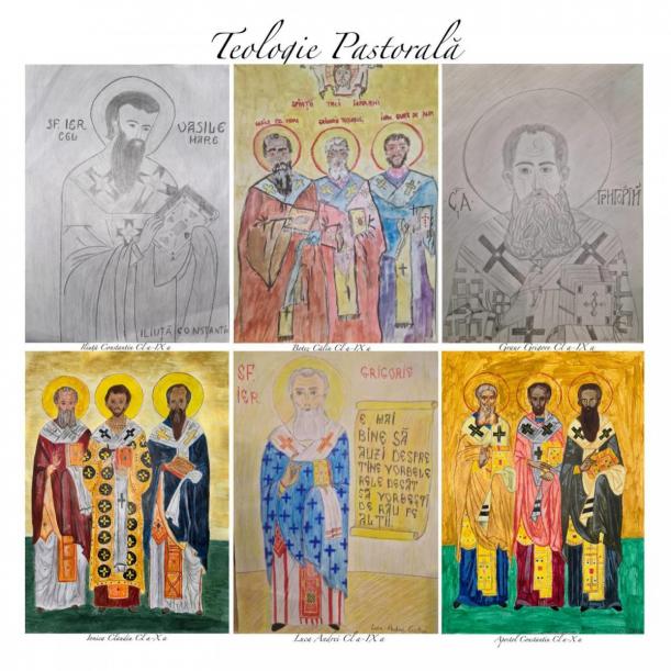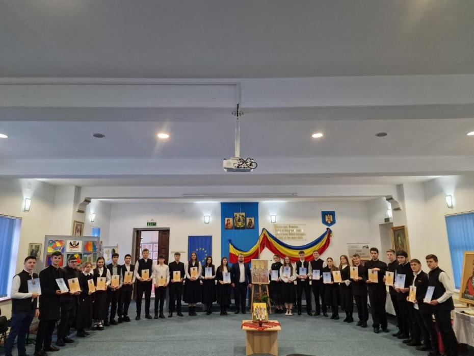 Programul zilei a continuat în sala de festivități, unde elevii Irina Voineag și Andrei Zabolotniuc, coordonați de profesorii Mirel Gălușcă și Andrei Irina, au prezentat bogate informații despre viața și activitatea ocrotitorilor învățământului teologic ortodox.