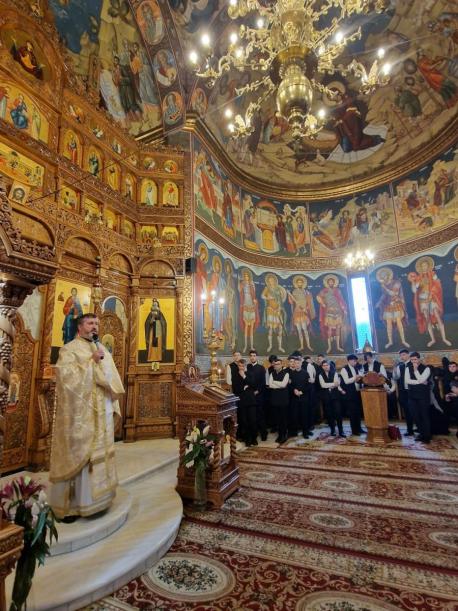Atât la slujba de seară, cât și la Sfânta Liturghie, răspunsurile de la strană le-au dat elevii și elevele Seminarului, coordonați de spiritualul și profesorul de Muzică Bisericească, pr. Marius-Gabriel Brumă, și de diac. prof. Gelu Ioniță. Am remarcat în acest an grupul psaltic de fete care a cântat în strana stângă a bisericii Sfântul Ioan Iacob, continuând o frumoasă tradiție, împământenită la Seminarul nemțean.
