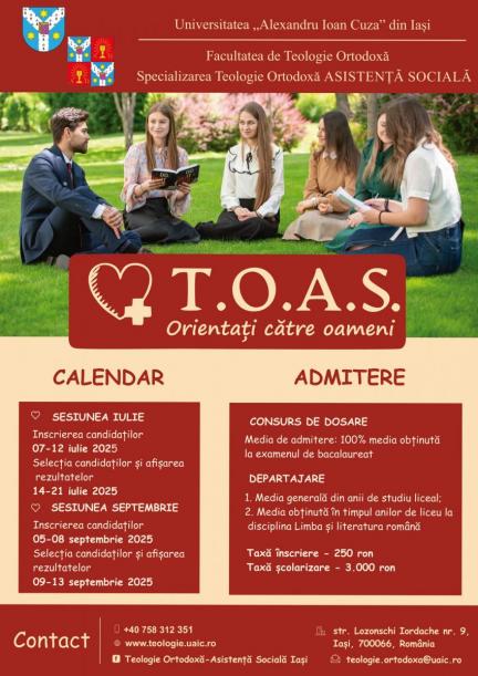 Facultatea de Teologie Ortodoxă „Sfântul Dumitru Stăniloae” din Iași reprezintă o comunitate academică vie, ancorată în Tradiția Bisericii și dedicată formării integrale a omului: duhovnicește, intelectual și profesional. În cadrul Universității „Alexandru Ioan Cuza” din Iași, programul de licență Teologie Ortodoxă Asistență Socială (TOAS) îmbină în mod armonios învățătura mântuitoare a Ortodoxiei cu instrumentele moderne ale asistenței sociale, într-o sinteză menită să răspundă nevoilor reale ale omului contemporan. Această specializare este destinată celor care doresc să trăiască credința ortodoxă ca mărturie vie și slujire concretă a aproapelui, în spiritul Sfintei Evanghelii și al iubirii jertfelnice. Programul este un parcurs universitar și o călătorie duhovnicească, în care cunoașterea științifică și teologică se împletește cu fapta milei sufletești și trupești, iar formarea academică se transformă în angajament creștin pentru vindecarea suferinței sociale.